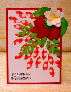I used the same Gina Marie dies,but this time I cut a white panel stamped it with an IO sentiment and backed it with some red gingham paper. I used IO strawberries and flower in the corner. My team mates have created some gorgeous examples for you HERE. We can't wait to see your gingham designs.