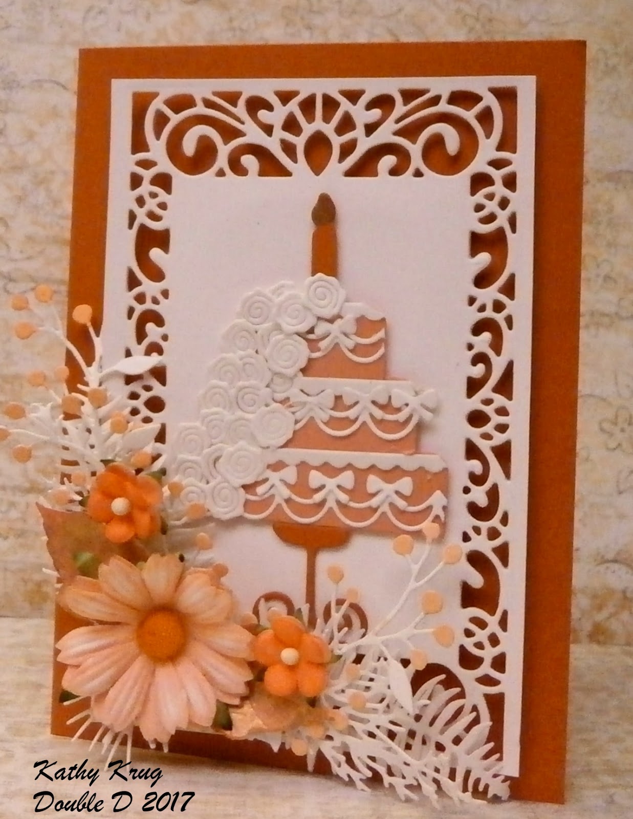 ReplyDeleteStunning card, Kathy! Good for you to have that glue thing, because you sure do work wonders with it! I have the opposite feelings for glue--glue phobia! The cake looks so pretty, I'd be afraid to take the first slice! Your flower spray is gorgeous, and I love how you've layered this all on that gorgeous SW background die! Great design and lovely colors! Happy Blog Birthday!